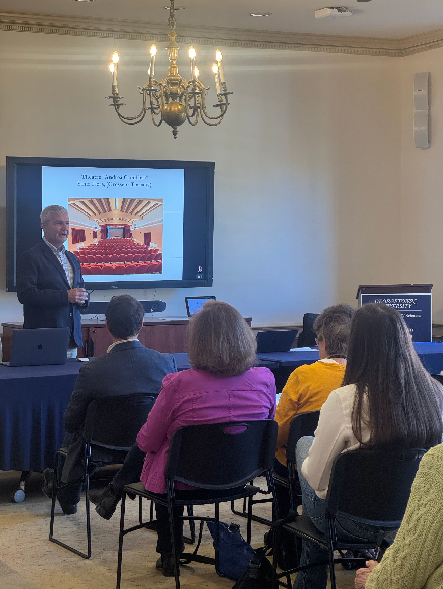 The event featured a presentation in celebration of the birthday of Andrea Camilleri, renowned Italian author of Inspector Montalbano. The discussion began with a presentation by Professor Gianni Cicali (Florence, Italy), who spoke about Camilleri’s theatrical career, followed by a presentation by Professor Anna De Fina, exploring Andrea Camilleri’s distinctive use of dialect throughout his texts.