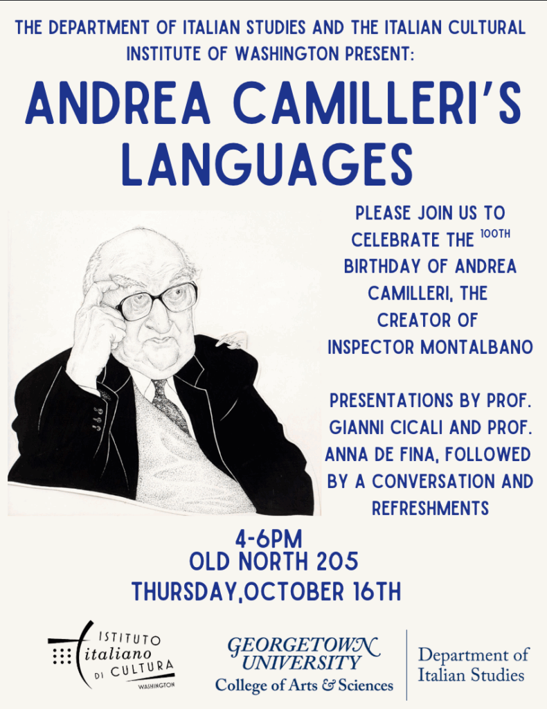 On Thursday, October 16th the Department of Italian and the Italian Cultural Institute hosted Camilleri’s Languages, an event featuring the presentations of professors Gianni Cicali and Anna de Fina.